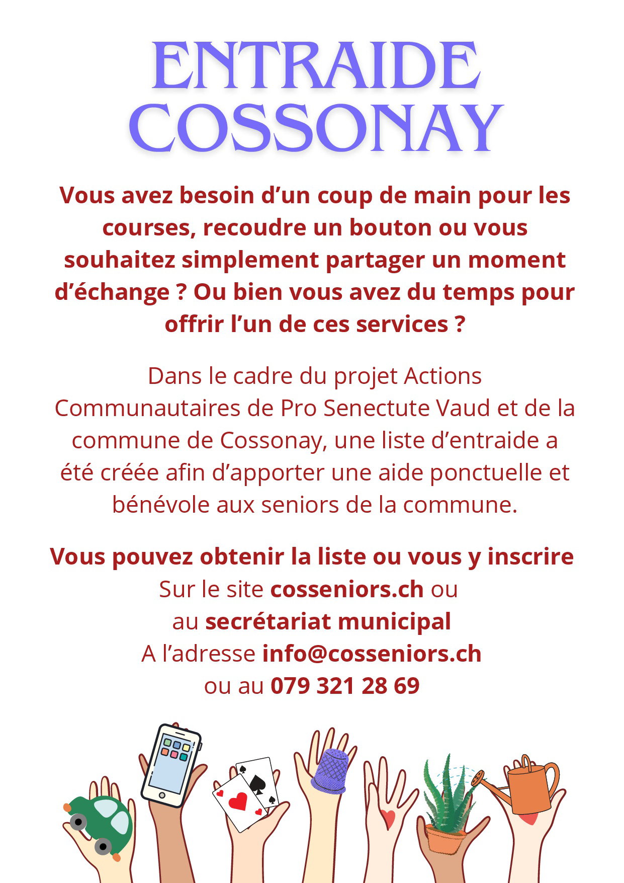 Vous pouvez obtenir la liste des personnes prêtes à vous aider en envoyant un message à info@cosseniors.ch ou en passant au secrétariat de l'administration communale, Place de la Vy-Neuve.