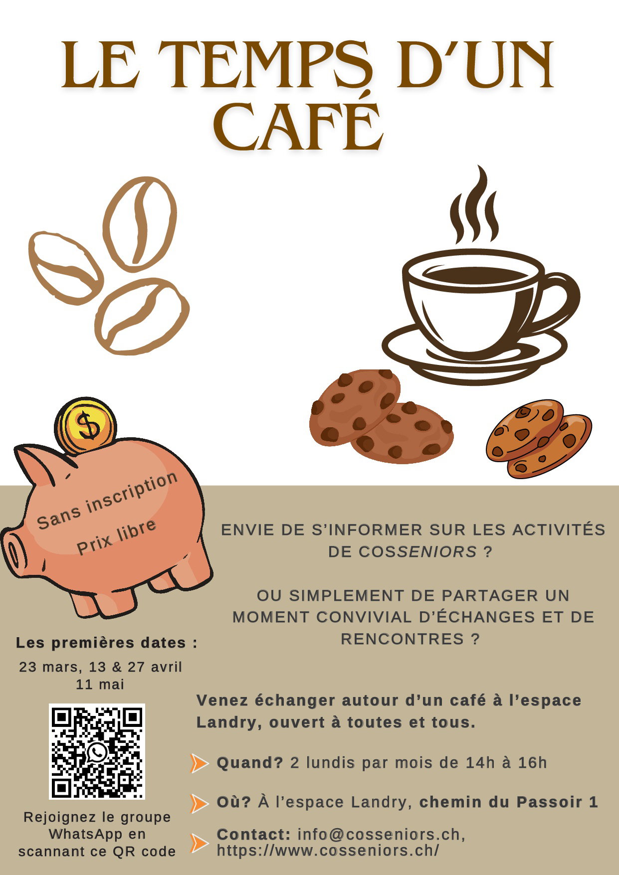 Les lundis après-midi, une semaine sur deux, venez papoter autour d'un café et en apprendre un peu plus sur CosSeniors et ce qui se passe à Cossonay et sa région.